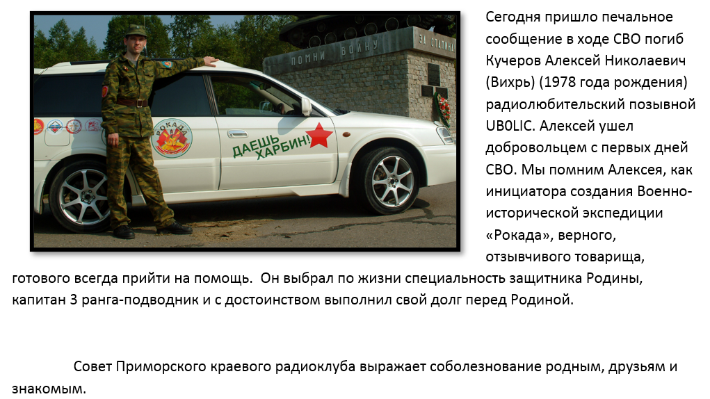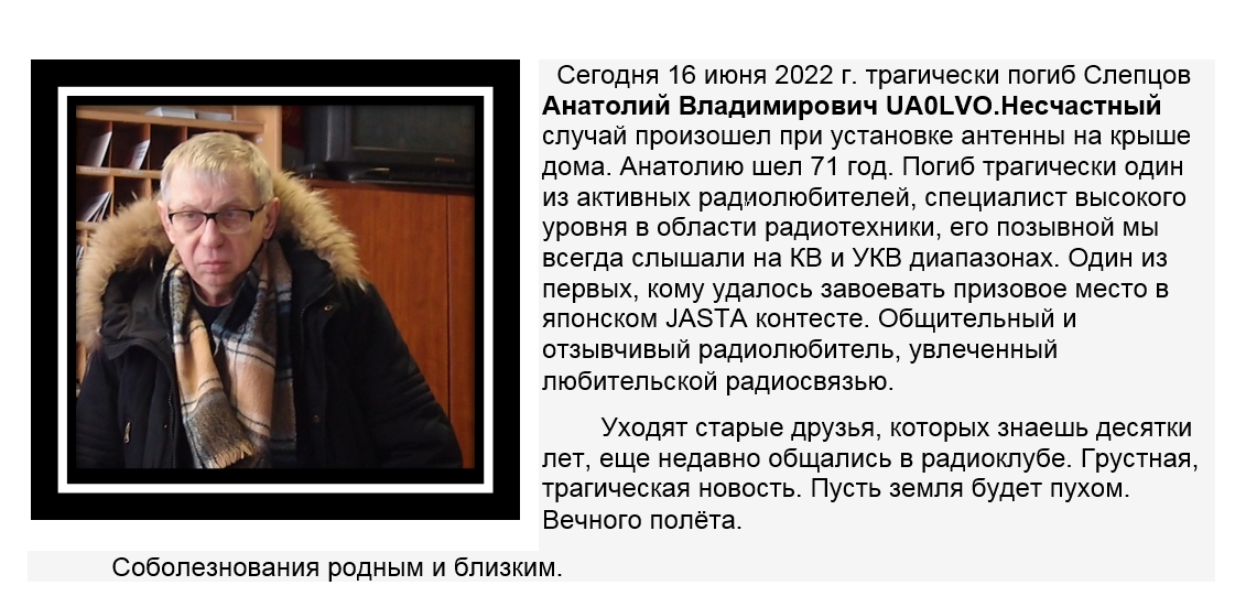 22 июня в 10.30 в крематории на морском кладбище(ул. Патрокл 6 ст.2 (двухэтажное кирпичное здание) состоится прощание со Слепцовым Анатолием Владимировичем UA0LVO