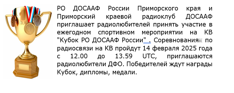 28 февраля 2025 на диапазонах от 160 до 40 метров пройдет первый Любительский Чемпионат Дальневосточного федерального округа по радиоспорту телефоном. Приглашаются радиолюбители ДФО.